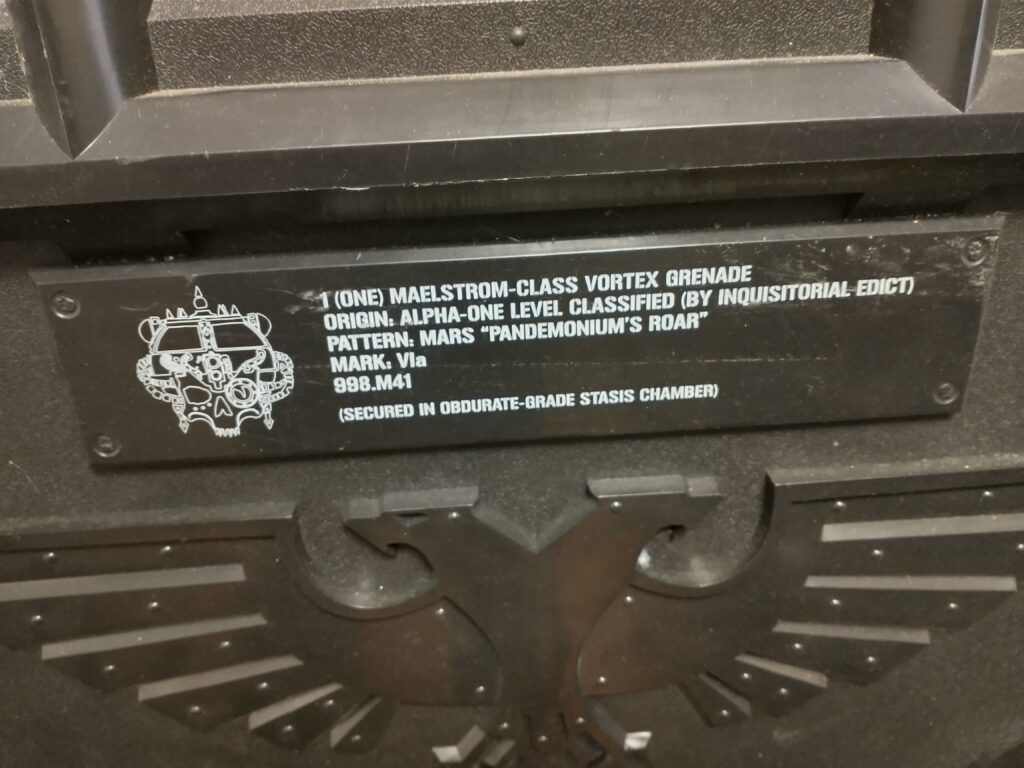 Games Workshop occasionally puts out ‘in-world’ props from their games. Most of these have been from Warhammer 40K, but the occasional one shows up from their other games. In this case (literally), they made a custom carrying case for figures, and decorated it as a stasis chamber for a single vortex grenade. I love collecting in-world props from various media properties, and 40K has no shortage of these!
